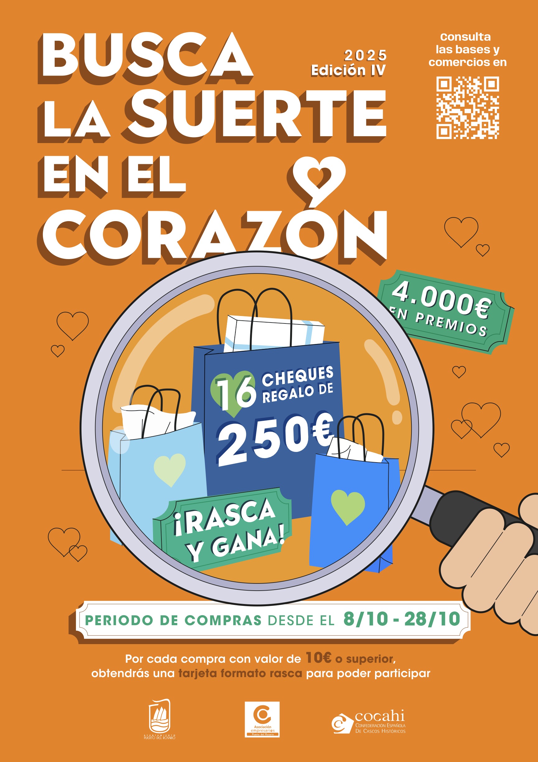 1. La campaña comercial «Busca la suerte en el corazón» vuelve a Puerto del Rosario con más de 4.000 euros en premios para incentivar las compras en los establecimientos locales. Del 8 al 28 de octubre, los clientes que gasten al menos 10 euros en uno de los 90 comercios participantes recibirán una tarjeta «rasca y gana». La campaña, organizada por la Asociación de Empresarios de Puerto del Rosario, cuenta con el apoyo del Ayuntamiento y la Confederación Española de Cascos Históricos.